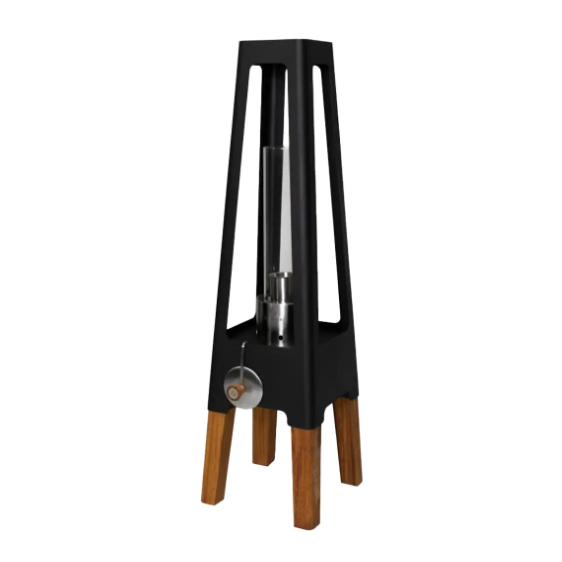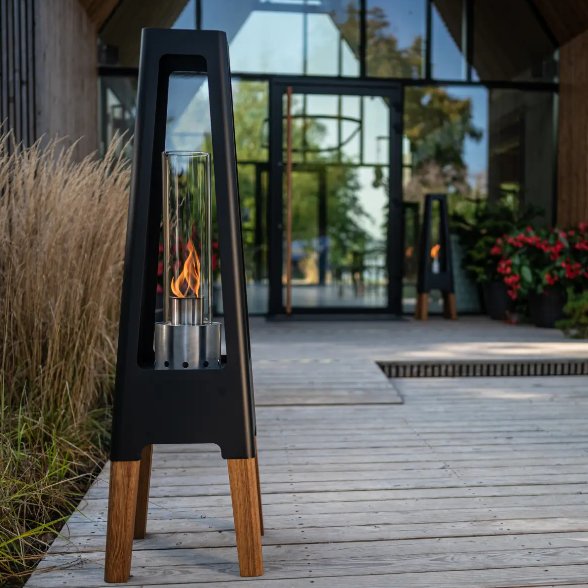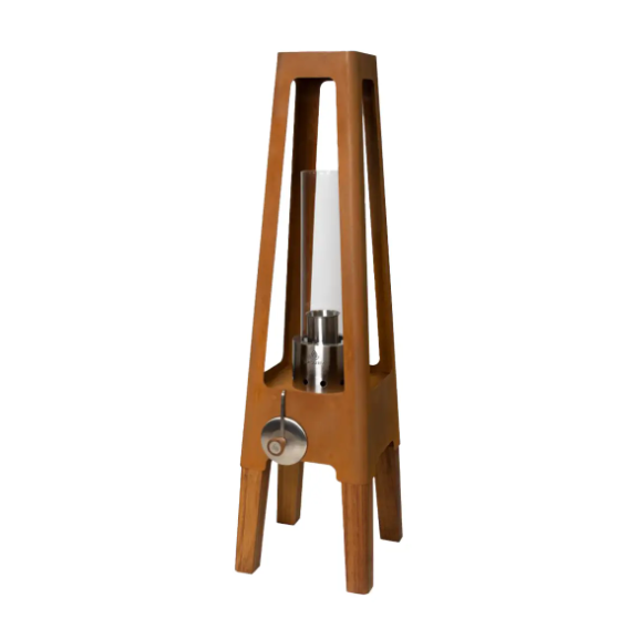op het terras. Het minimalistische ontwerp wordt geaccentueerd door de stalen behuizing. De lamp is gemaakt van staal en acaciahout, dat wordt gebruikt voor de poten. Een functioneel alternatief voor kaarsen – voor meer sfeervolle verlichting in uw omgeving.